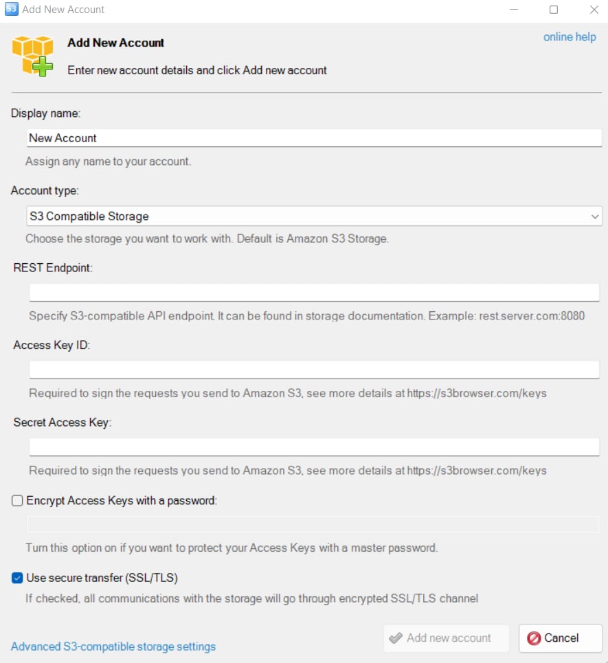 Настройте S3 Browser для доступа к объектному хранилищу. Для этого добавьте новую учётную запись S3: